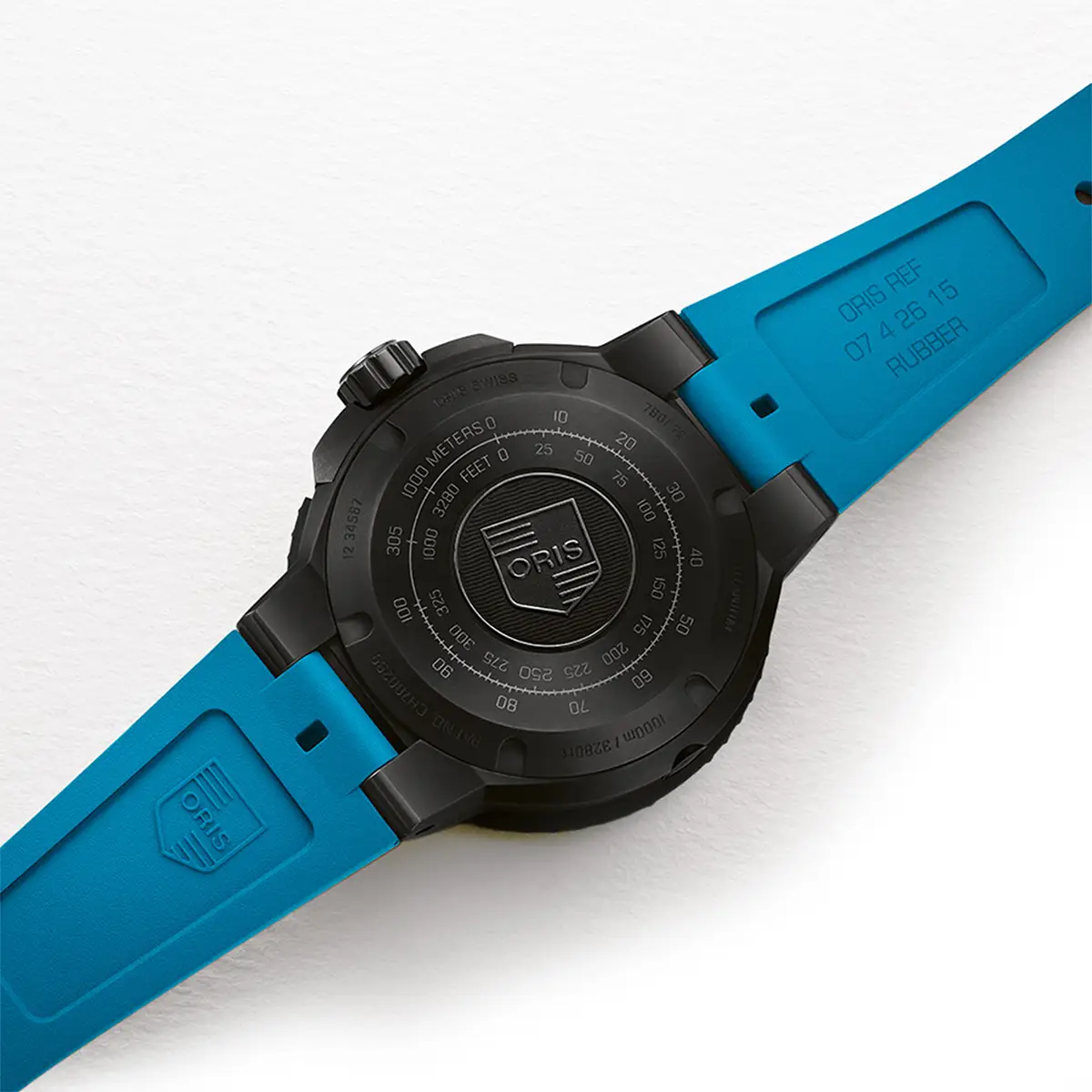 Oris AquisPro 1000m con esfera azul y correa de caucho azul. Un diseño técnico y funcional con movimiento automático y lectura clara.