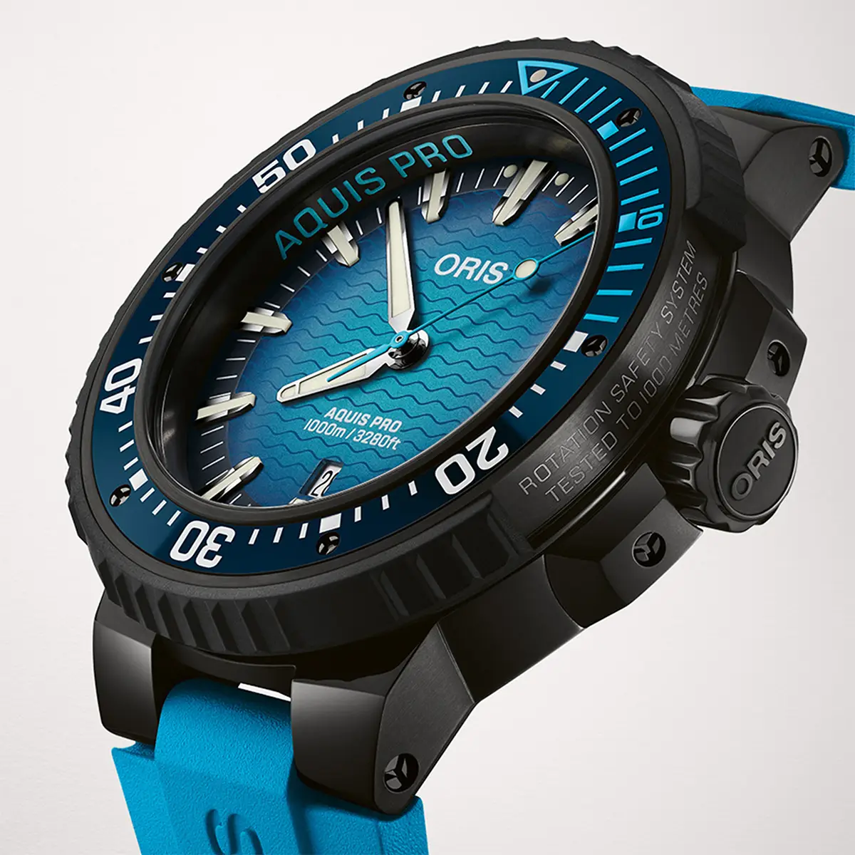 El Oris AquisPro 1000m en azul incorpora una caja robusta, un bisel de alta precisión y una correa de caucho diseñada para ofrecer seguridad y comodidad. Su estética conserva la claridad que identifica a la familia Aquis.