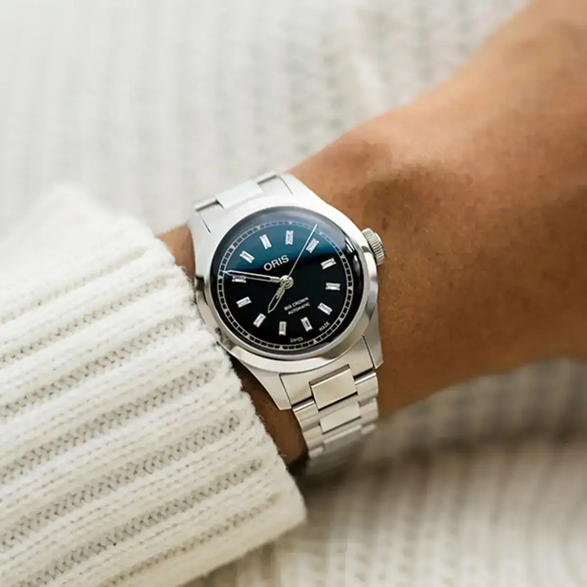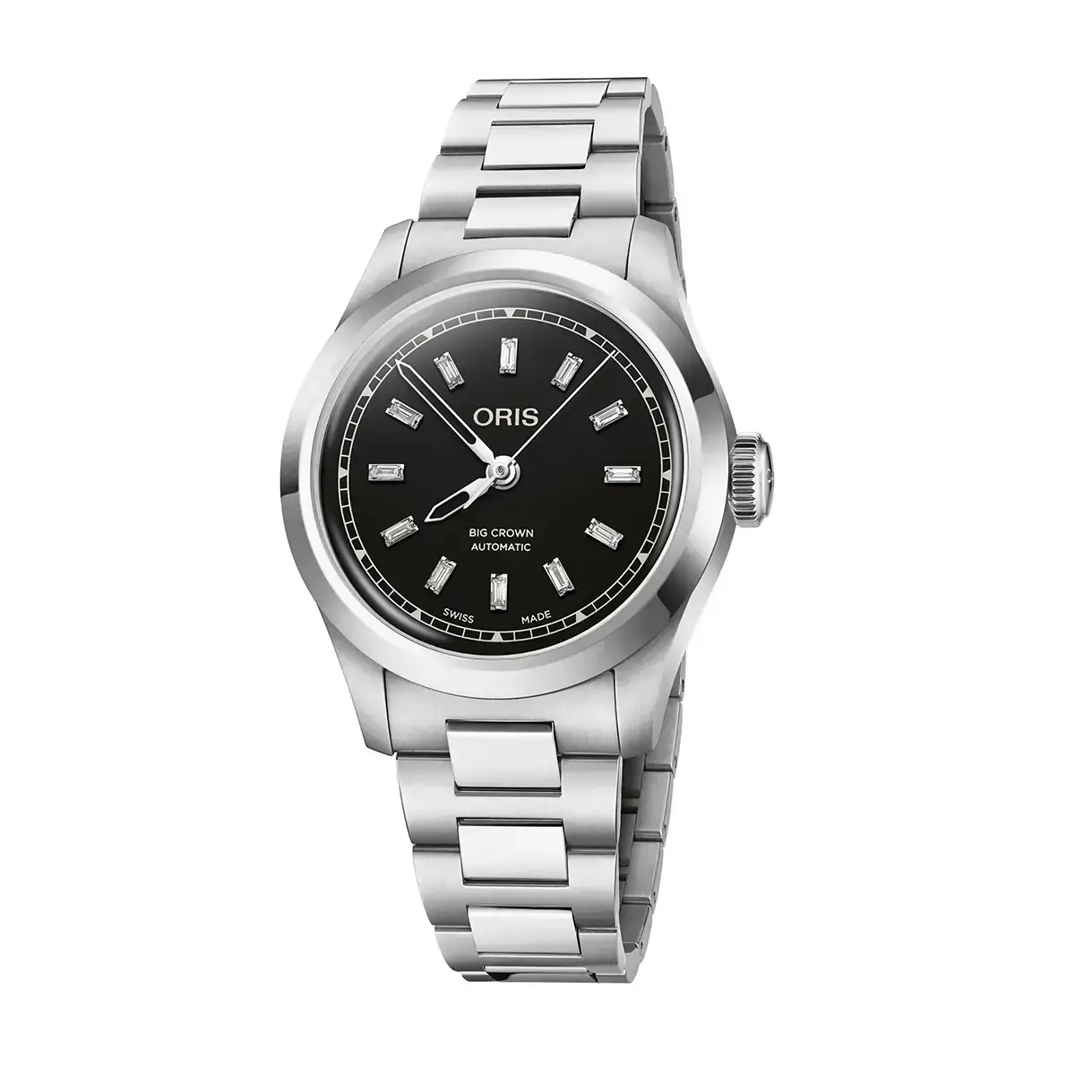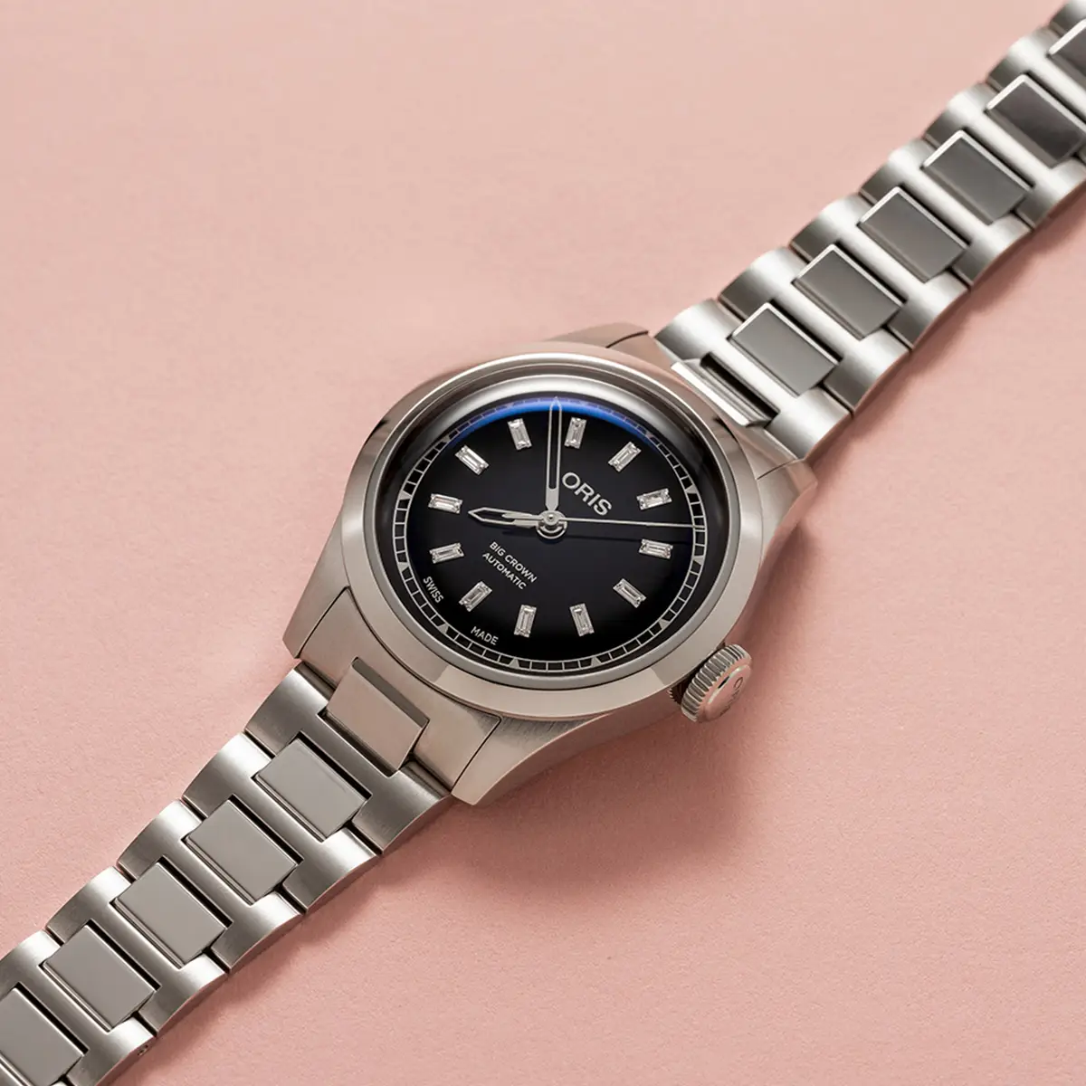 Oris Big Crown Diamonds con esfera negra y brazalete de acero. Un diseño clásico con un acento discreto y una estética clara para el uso cotidiano.