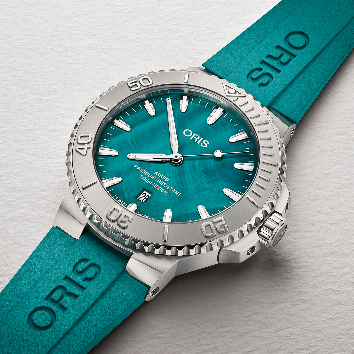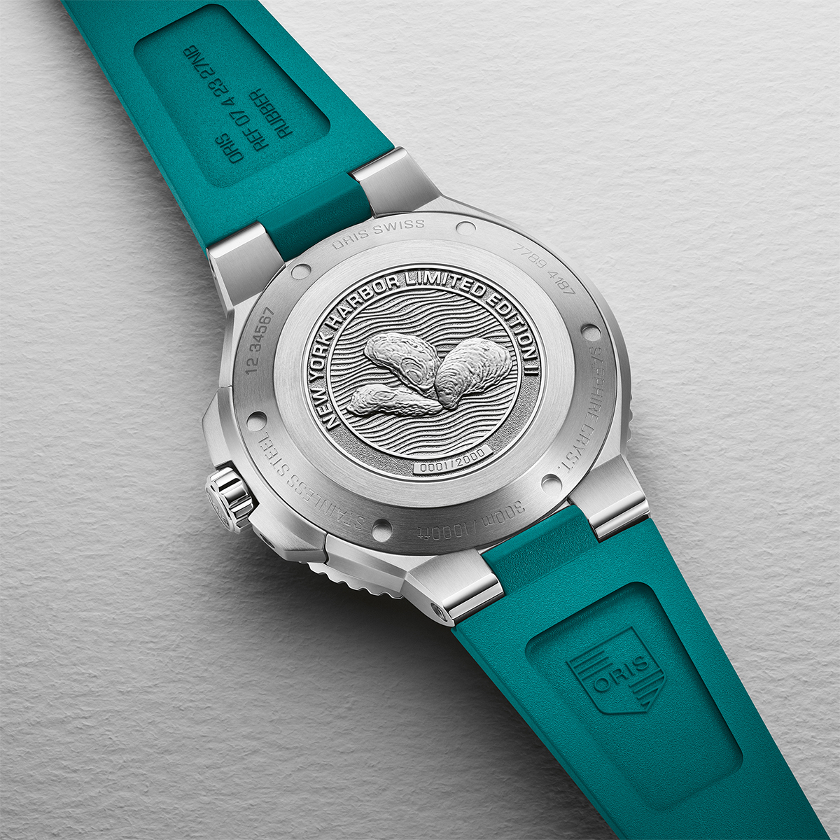 Oris New York Harbor Limited Edition II con esfera turquesa y correa de caucho. Un diseño inspirado en ambientes marítimos con estética contemporánea y construcción sólida.
