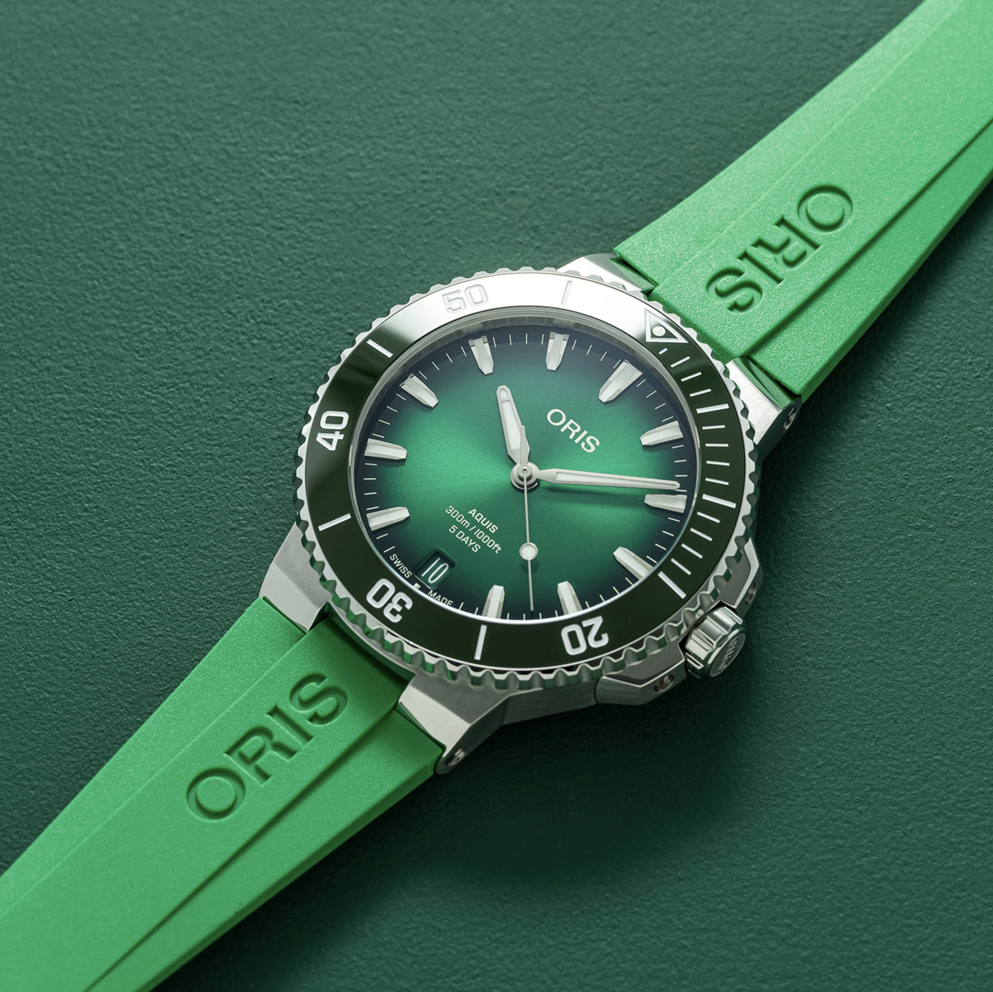 Oris Aquis calibre 400, caratula verde, correa de caucho verde, reserva de marcha 120 hrs, resistencia al agua 300m