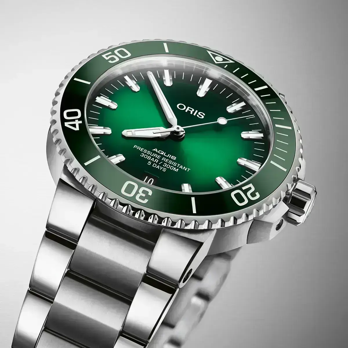 Oris Aquis Date Calibre 400 con esfera verde y brazalete de acero.