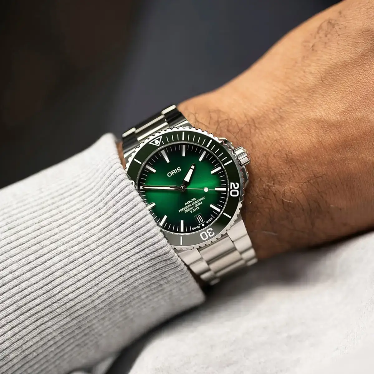 El Oris Aquis Date Calibre 400 presenta una esfera verde de acabado profundo que aporta carácter y claridad visual. Su brazalete de acero refuerza una presencia sólida y bien proporcionada.