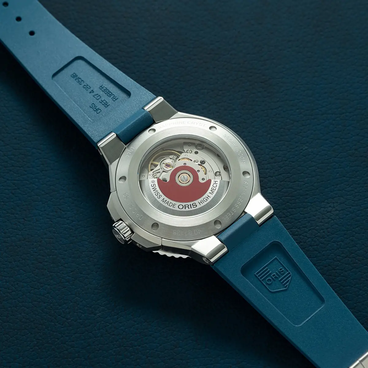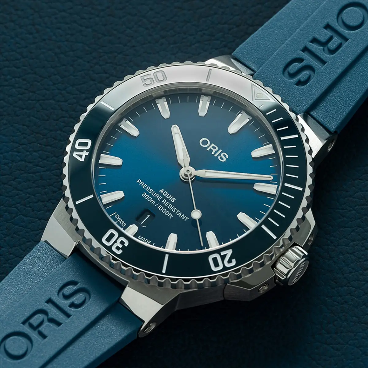 Oris Aquis Date 41.5 mm con esfera azul y correa de caucho azul. Un diseño deportivo y equilibrado con movimiento automático y estética contemporánea.