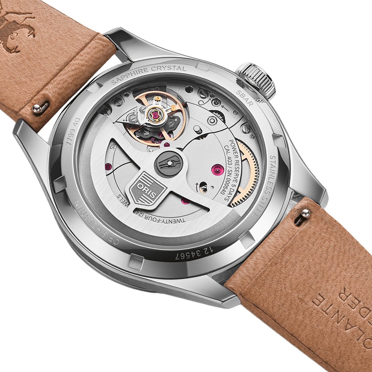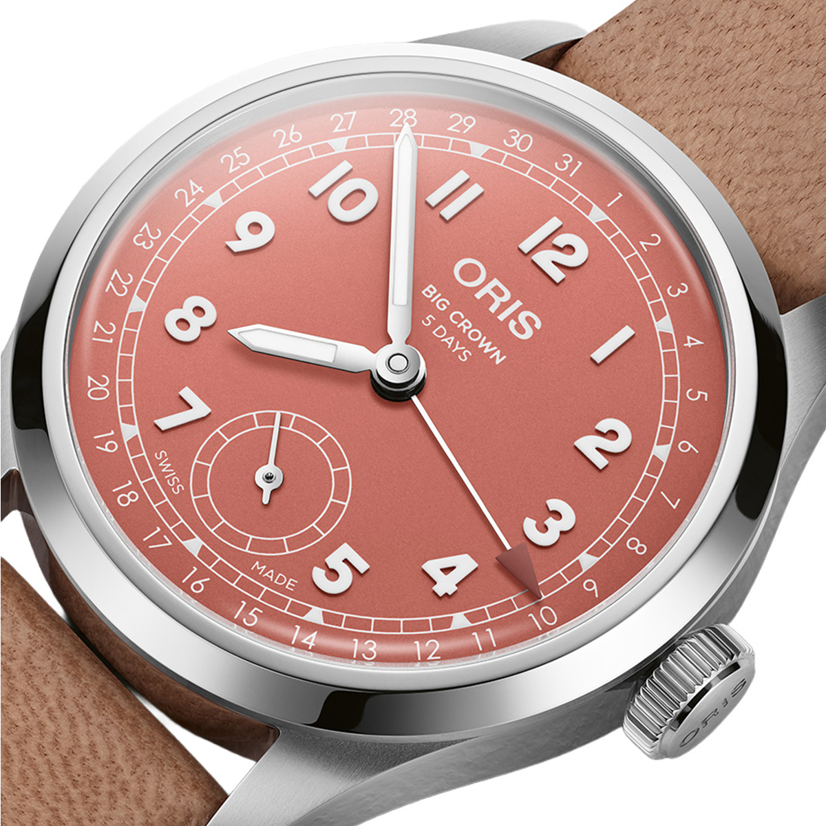 Oris Big Crown calibre 403, caratula color rojo, correa de piel cognac, reserva de marcha 120 hrs, resistencia al agua 100m