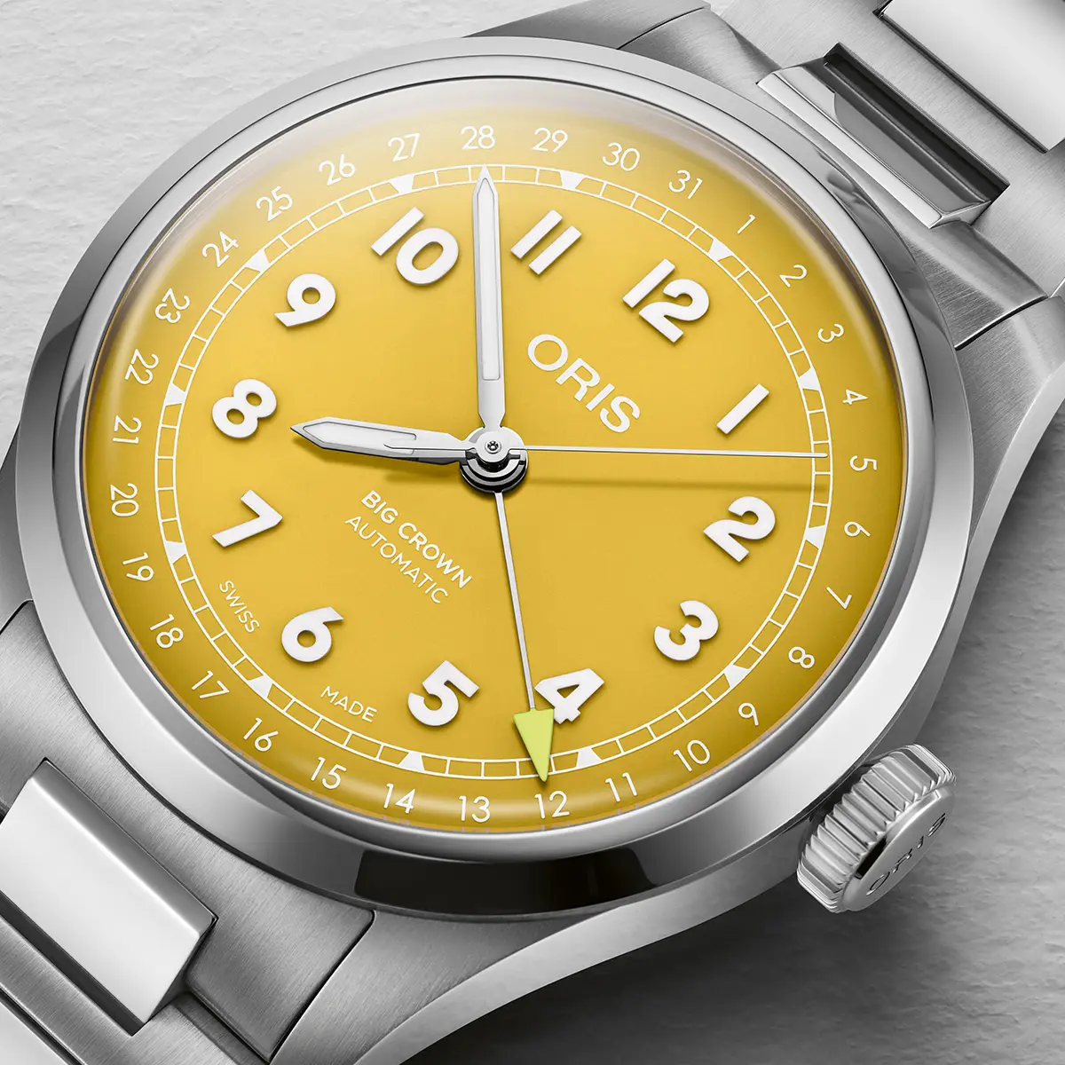 El Oris Big Crown Pointer Date de 40 mm presenta una esfera amarilla precisa, una caja de acero equilibrada y un brazalete metálico continuo. Es una interpretación moderna de uno de los relojes más reconocibles de la marca.