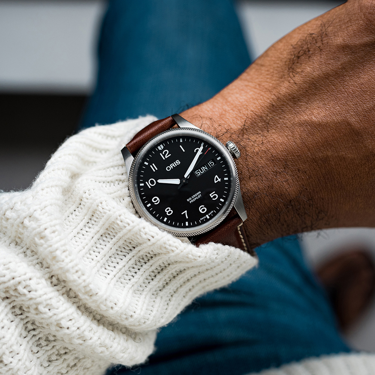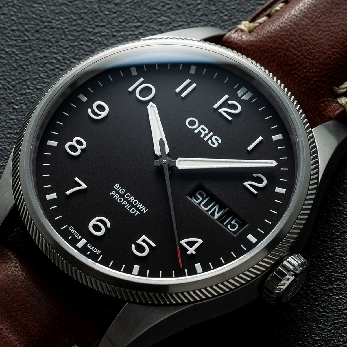 Oris Big Crown Propilot day date, caratula color negro, correa piel cafe, reserva de marcha 41 hrs, resistencia al agua 100m