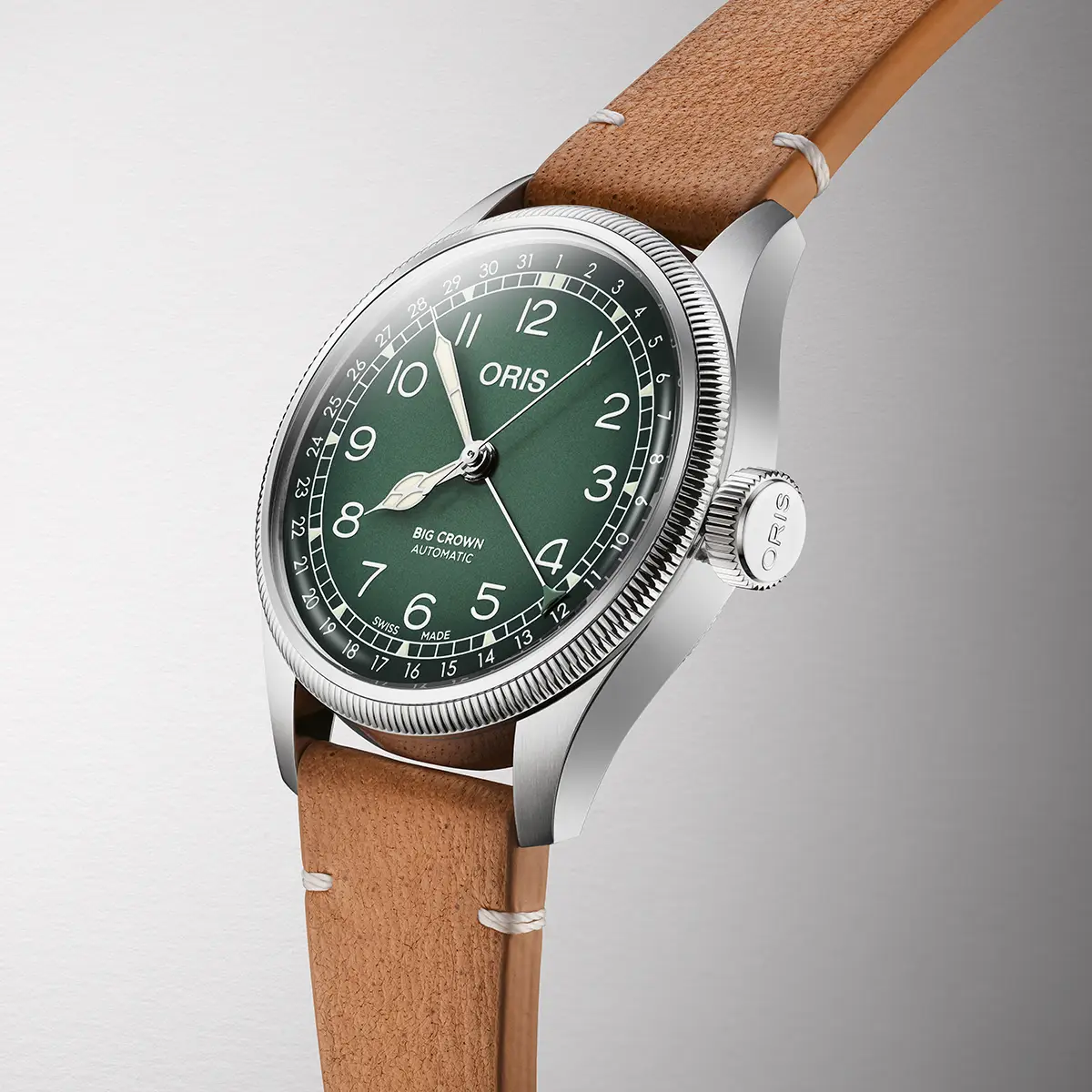 Oris Big Crown x Cervo Volante con esfera verde y correa de cuero natural. Una pieza inspirada en paisajes alpinos, con diseño funcional y un enfoque contemporáneo.