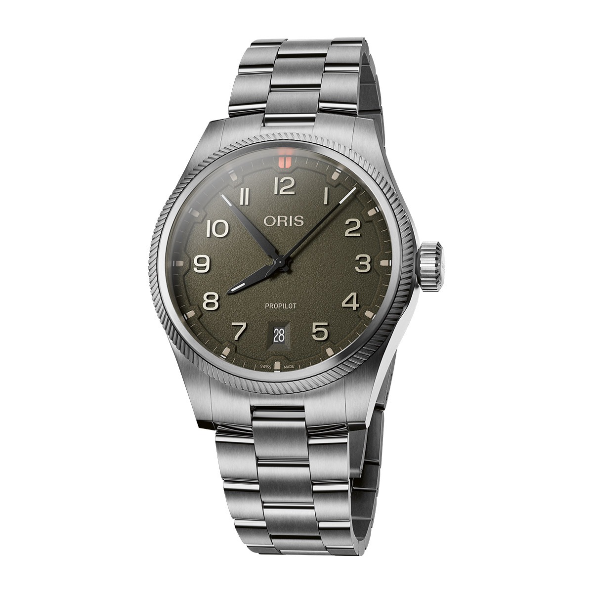 Oris ProPilot Date con esfera verde oliva y brazalete de acero. Un diseño funcional con estética contenida y enfoque técnico para el uso diario.